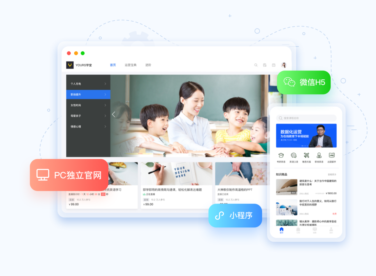 只需一键注册开店,即可拥有自己的专属知识店铺,可支持微信H5、微信小程序、PC独立官网形式,实现移动和PC端的展示曝光,助你获取全网流量,打造最佳用户使用体验。