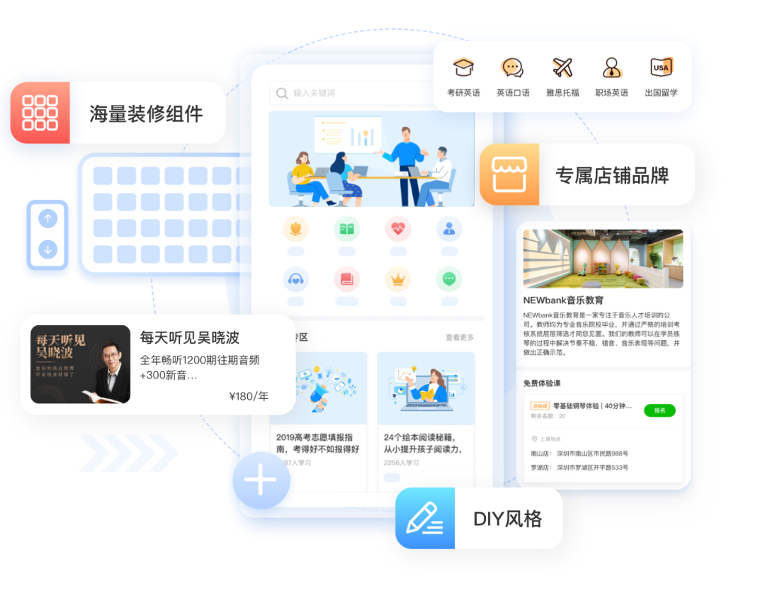 数十种装修组件和模板,适应不同细分行业的店铺调性,满足你的DIY风格,打造与众不同的专属知识店铺品牌,具备更强的展示属性和变现转化能力。