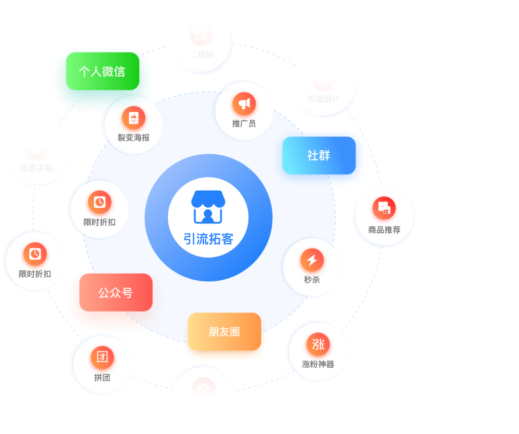 大量社交营销推广玩法,包括裂变、拼团、好友助力、推广员等数十种,贯通个人微信、社群、朋友圈、公众号等社交场景,持续不断实现获客转化。