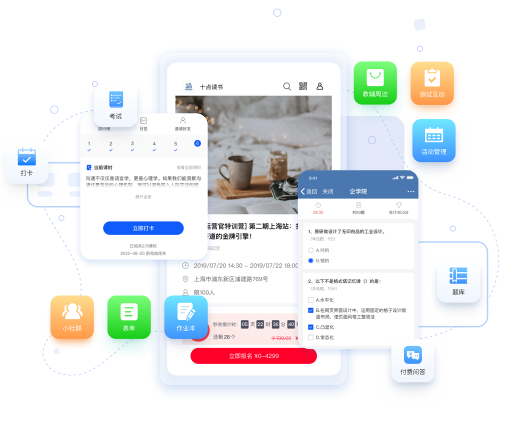 自定义导入题库和试卷库,实现考试、作业本、练习及随堂测验,强化学习效果;可创建日历打卡、作业打卡、考试打卡等玩法,形成督学玩法,提高学员活跃度。